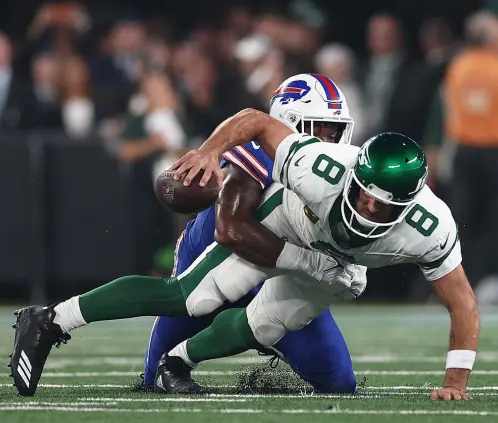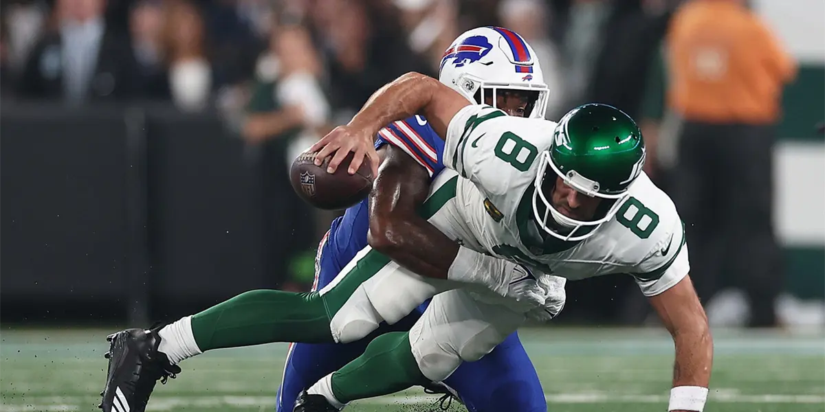 El QB de los New York Jets, Aaron Rodgers, se retiró lesionado del emparrillado luego de haber sido capturado por Leonard Floyd de los Bills de Buffalo